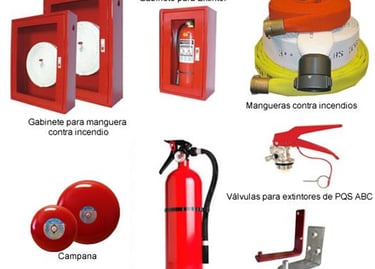Extintores, gabinetes, soportes, mangueras, válvulas, manometros, etc.